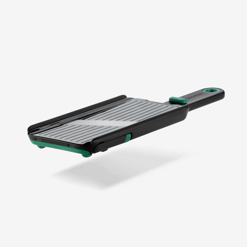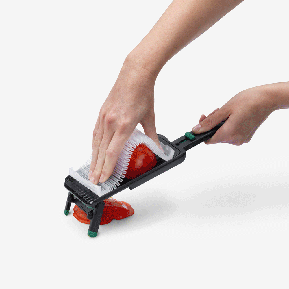 Nocutu, esnek parmak koruyucusunun raylar üzerinde hareket etmesi sayesinde son dilime kadar güvenli kesim yapılmasını sağlayan bir mandolindir.