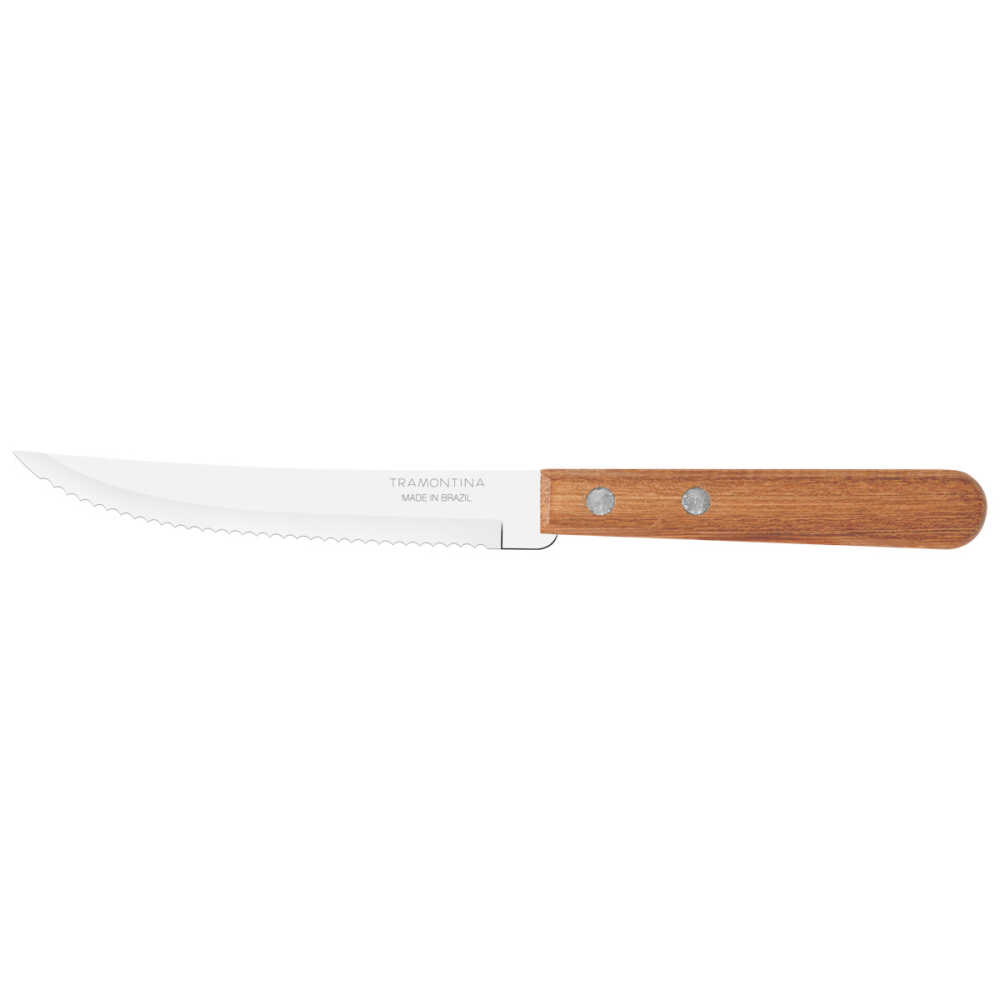 Tramontina Churrasco 22300/405 13cm Biftek-Steak BıçağıAlüminyum perçinlerle tutturulmuş doğal ahşap saplarla Dynamic Line bıçaklar, yemeklere rustik ve güzel bir dokunuş katıyor. Çeliğin kalınlığı ve tasarımı, ürünlerin kalitesinin mükemmel olmasını garanti eder.
